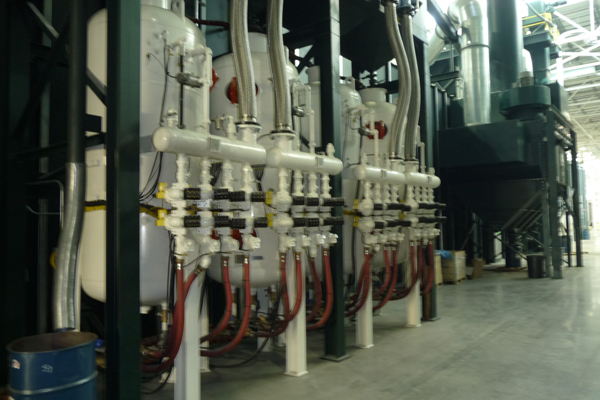 噴砂室有2套噴砂系統,主機選用A3-P4型高效式。該機是日本厚工設備產品。特點是:儲丸量大、安全可靠、維修簡單,易損件相當少;靈敏度高;常閉型控制,在任何故障情況下,安全關機,不會影響其余人員操作;獨特的砂閥設計,很方便地調節砂氣比,效率高出一般設備30%,節省能源。