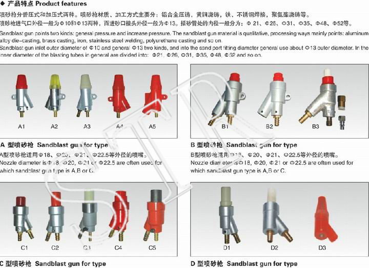 噴砂槍分普壓式和供壓式不同。噴砂槍材質、制作手段主要是分:鋁鎂合金壓鑄,銅合金澆鑄,鐵、不銹鋼材質激光焊接,聚胺脂澆鑄等。