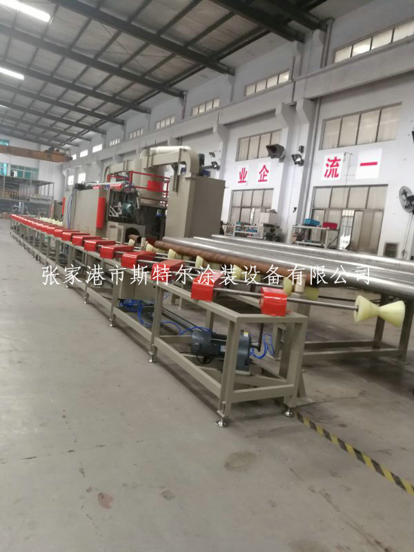 噴砂機,由噴砂室、上料架、旋轉輸送、噴槍移動和高度調節、下料架、砂塵分離、儲料箱、除塵器及控制等幾部分組成,加工過程中管道一邊移動一邊旋轉,在噴砂區域設置移動噴砂槍32套,即可實現管道外壁的全覆蓋。整套設備采用全自動控制。為延長設備的維護周期,在主機內部斜斗處,安裝10mm耐磨板;噴砂設備采用全自動回收裝置,提升機快速回收沙料裝置,有效的無死角回收,全程監控防跑偏裝置,提高