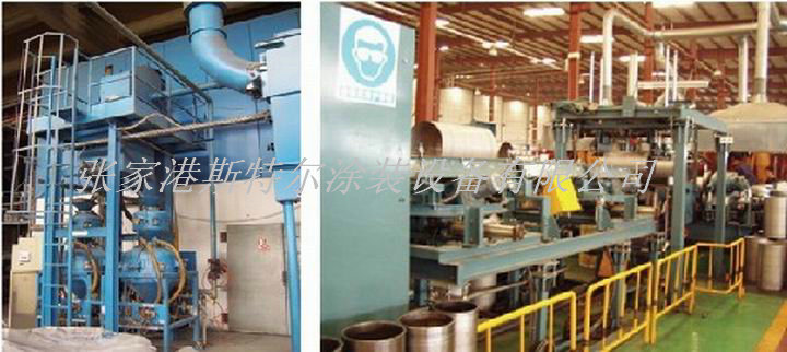 Features: the workpiece in conveying system, gush arenaceous enclosure, gush arenaceous system, abrasive, recovery system, dust removal system, gun movement mechanism, the cylinder positioning rotating mechanism, control system and air pressure equipment composition; The conveying system using closed rail product put suspension conveyor chain, by the transportation lines and branch circuitry, including cars and traction chain, bearing traction on the chain operation, carrying the car to promote pusher traction chain and carrying the car has its own orbit; Gush arenaceous cabinet for a through the type an airtight room, for steel, steel skeleton make wall, interior stick around, the rubber on each side of a fully automatic pneumatic door set, the top slot, the top slot rubber seal structure, the cabinet has set up four side glass Windows, another side decorate two aspiration mouth, gush arenaceous box at the bottom of the cone shape made a collection of sand scuttle; Gush arenaceous system consists of sandblasting machine, gush arenaceous tube, nozzle composition, sandblasting machine is to have three the nozzle of the automatic continuous sand-up sandblasting machine, job tanks and abrasive supply tank two cabin, respectively is equipped with a material level controller to explore, abrasive, the nozzle of the material of hard alloy; Abrasive recovery system by conveying equipment, abrasive, abrasive circulation purification device component, abrasive circulation conveyor consists of conveying equipment and vertical level ascension device of two parts, the level of the abrasive conveying equipment will be transported to the vertical ascension device, again by vertical conveyor to improve device vertical abrasive, abrasive purification equipment purification equipment for the curtain type separator, the system and dust removal system connected; Ventilation dust removal system by duct, flow regulator, centrifugal fan, efficient flow of dust filter canister sink, centrifugal fan is the whole system conveying the power source of the dust; Gun by motor sports organizations, reducer, walk the car and drive mechanism composition, motor can be at the highest speed limit 1.5 m/min next stepless speed regulation, motor drive gun stem vertical linear motion; do The cylinder rotating mechanism by motor and reducer, a transmission mechanism and roller, motor drive of rubber wheel rotation, through friction roller drive cylinders do turn movement; Positioning cylinders by positioning cylinders, positioning and stents, make up wheel cylinder bottle down, bottle on the center center, make gun gun to be able smoothly into the cylinder; The cylinder hoisting mechanism consists of a hook and stent, the enclosure of workers outside the lifting cylinder by suspension conveyor chain good transport into the cabinet position after piating; Control system by electronic control system and control system, electronic control system composed by the type of touch screen man-machine interface and PLC control mode to various equipment for the control of air control system control pneumatic components complete automatic action.