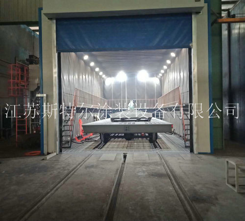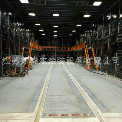 根據客戶要求及工件尺寸,房體工作尺寸設計為18x6x6.5m。本噴砂房體采用100mm方管做基本框架,內部采用50方管做內部支撐,內部鋪2mm鋼板及3mm橡膠板,外面壁墻采用50mm厚彩鋼夾心板制造,外形美觀、安裝便捷、防腐耐用。彩鋼板夾心層為聚苯乙烯發泡塑料,與常規用純鋼板制作的噴砂房體相比,具有以下特點: