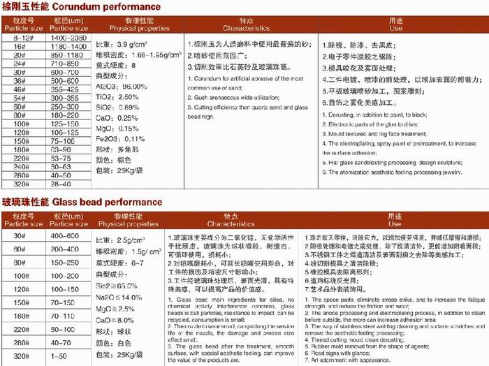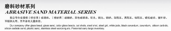 (噴砂用)夾層玻離窗珠、(噴砂用)夾層玻離窗砂、色彩夾層玻離窗珠、切丸、鋼丸、鋼砂、白剛玉、黑剛玉、棕剛玉、增碳硅砂、可塑料砂、冷庫保溫隔熱板的表層丸等。常期具有大批庫存量。