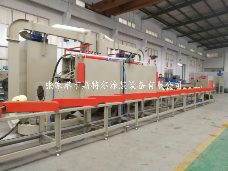 本套設備為管道自動噴砂機,由噴砂室、上料架、旋轉輸送、噴槍移動和高度調節、下料架、砂塵分離、儲料箱、除塵器及控制等幾部分組成,加工過程中管道一邊移動一邊旋轉,在噴砂區域設置移動噴砂槍32套,即可實現管道外壁的全覆蓋。整套設備采用全自動控制。為延長設備的維護周期,在主機內部斜斗處,安裝10mm耐磨板;噴砂設備采用全自動回收裝置,提升機快速回收沙料裝置,有效的無死角回收,全程監控防跑偏裝置,提高噴砂機設備的穩定性。除塵機采用防堵死專用濾筒,自動脈沖控制儀,按照不同的工礦環境設置時間。有效提高使用壽命及環保要求。該自動噴砂機配備的防滑托輥,能夠快速的將工件輸送的工作倉,并且使用壽命達到3-5年以上,為客戶在噴砂進行中的穩定性保駕護航。得到客戶的充分肯定。