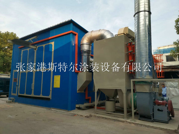 ●噴砂房內部尺寸(長度 7米×寬度5米×高度4米),房體骨架由型材制作而成,內部敷設專用噴砂房橡膠板作為防護,中間層為鋼板,最外層墻體敷設巖棉板進行消音及美觀; 防雨百葉窗: